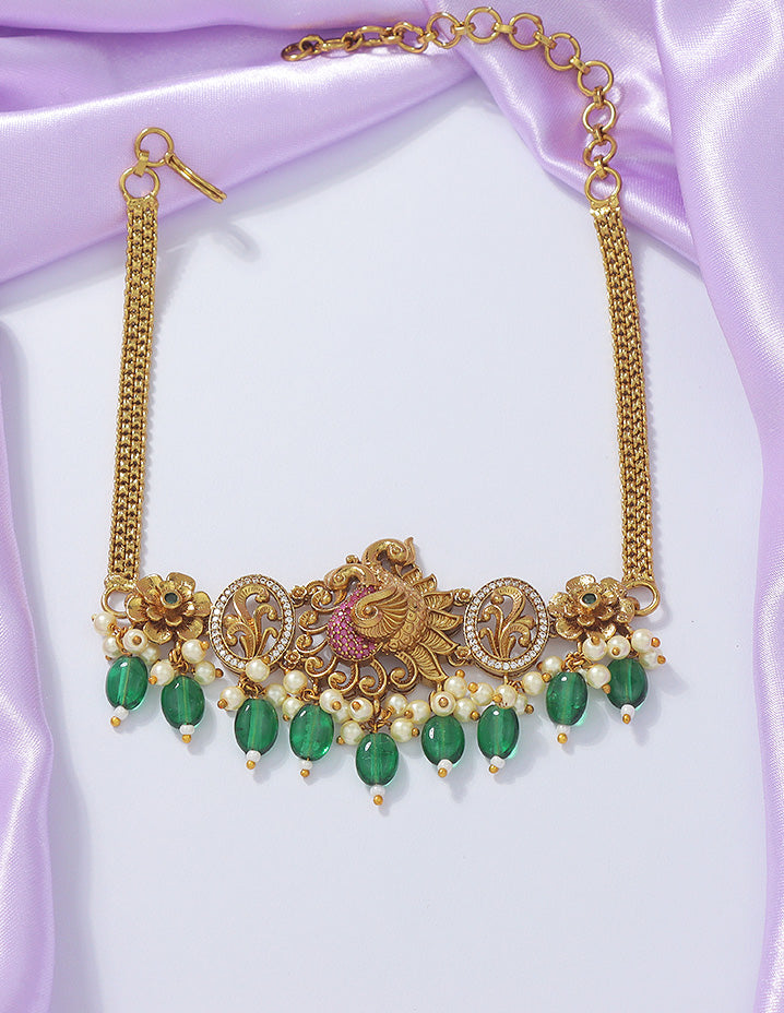 Radiate traditional charm with this antique gold-finish Bajuband, adorned with floral motifs, a striking stone centerpiece, green accents, and elegant with pearl drops—perfect for festive and bridal wear.