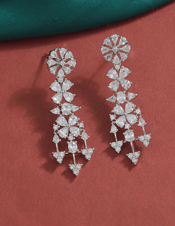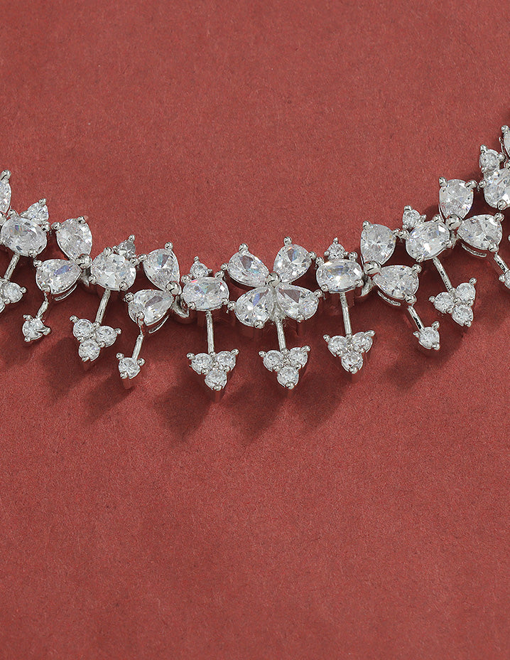 A radiant Rhodium-toned necklace and earring set adorned with sparkling Bud and floral motifs, perfectly blending elegance and charm for your special occasions.