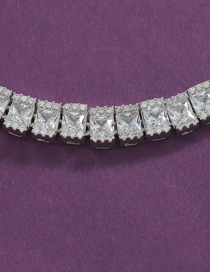 Elevate your ensemble with this Designer Zirconia Crystal Elegance Necklace Set, meticulously crafted with a sophisticated rhodium polish. The combination enhances durability while adding a radiant, long-lasting shine. Sparkling zirconia crystals are artfully arranged to capture light, offering refined sparkle ideal for formal occasions or timeless everyday glamour. This set balances classic design with expert craftsmanship to complement any attire with subtle luxury.