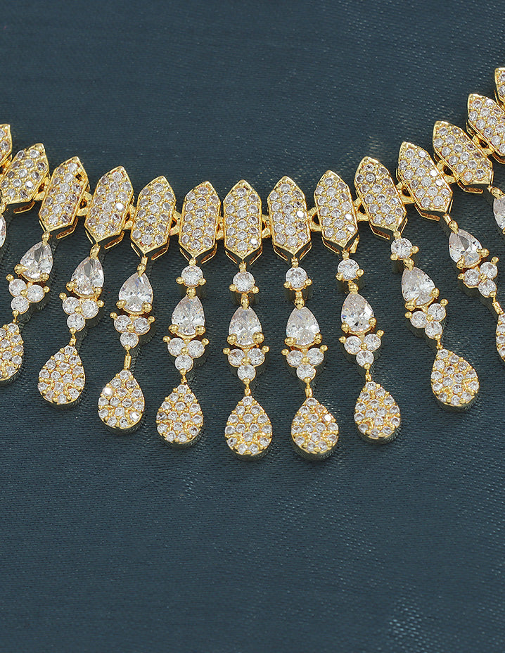 Elevate your style with this Designer Zirconia Elegance Necklace Set, featuring radiant white stones and a refined gold polish for timeless sophistication. Perfectly crafted to add a luxurious touch to any ensemble.