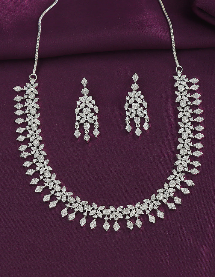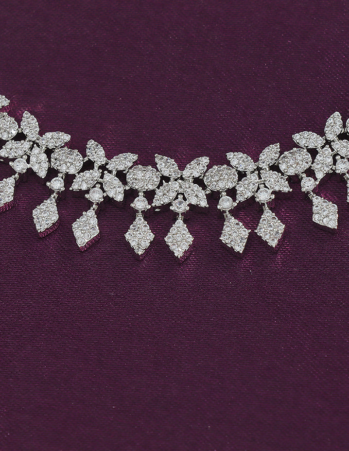 This Designer Zirconia Elegance Necklace Set features sparkling white stones enhanced by a durable rhodium polish. Its refined craftsmanship adds a sophisticated glow to any ensemble.