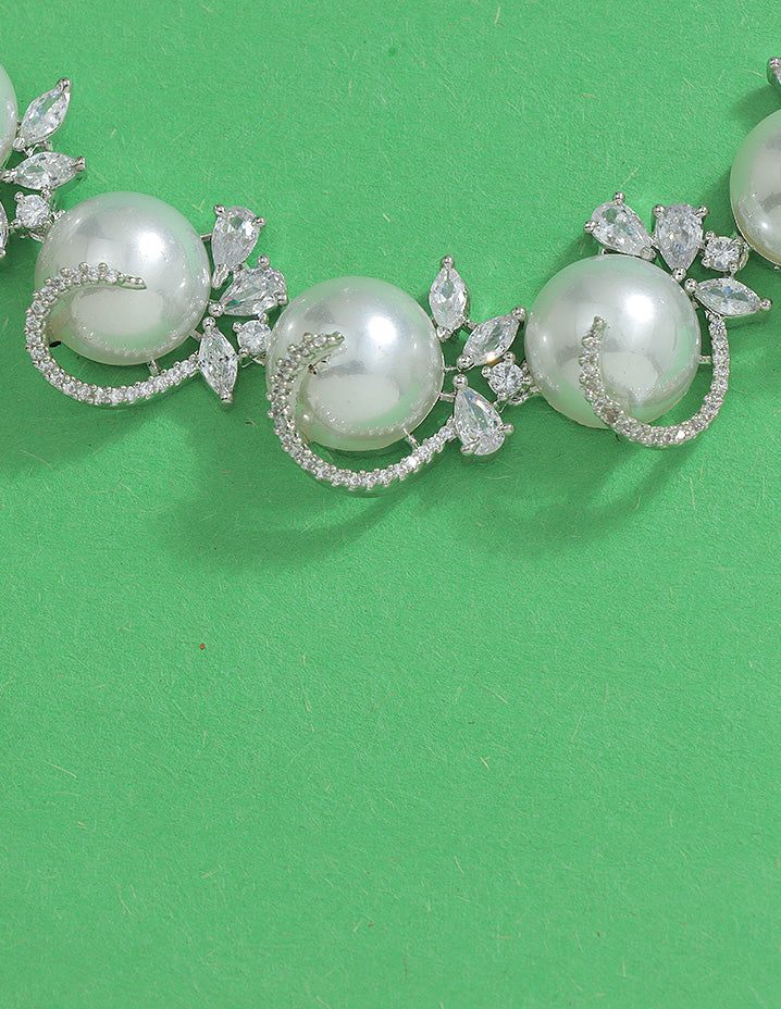 This Designer Zirconia Elegance Pearl Necklace Set features two lines of shimmering white zirconia stones, expertly set in rhodium-plated metal for a radiant, lasting shine. Its refined design offers a sophisticated touch to any ensemble, enhancing your elegance for special occasions or daily wear.