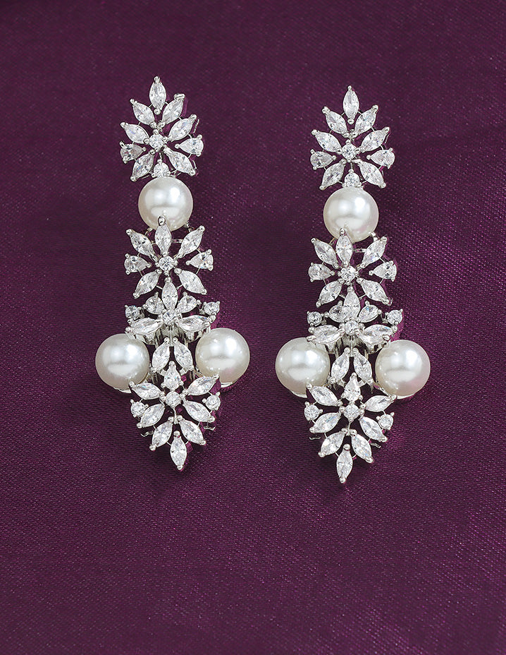 This Designer Zirconia Elegance Pearl Necklace Set features two lines of shimmering white zirconia stones, expertly set in rhodium-plated metal for a radiant, lasting shine. Its refined design offers a sophisticated touch to any ensemble, enhancing your elegance for special occasions or daily wear.