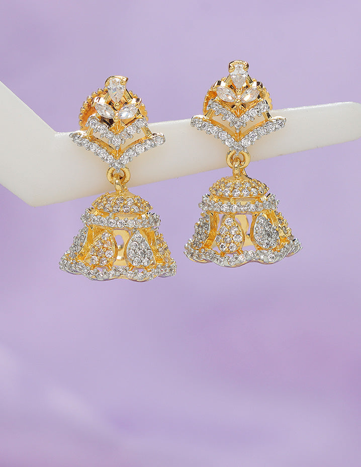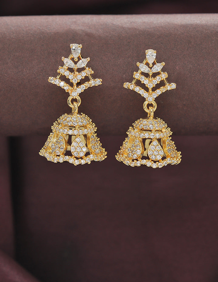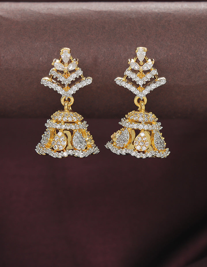 Designer earrings are classic jhumka-style danglers with a fusion of traditional and contemporary design. The bell-shaped drop is richly embellished with white stones and tear-drop dangles, paired with a sparkling oval top.