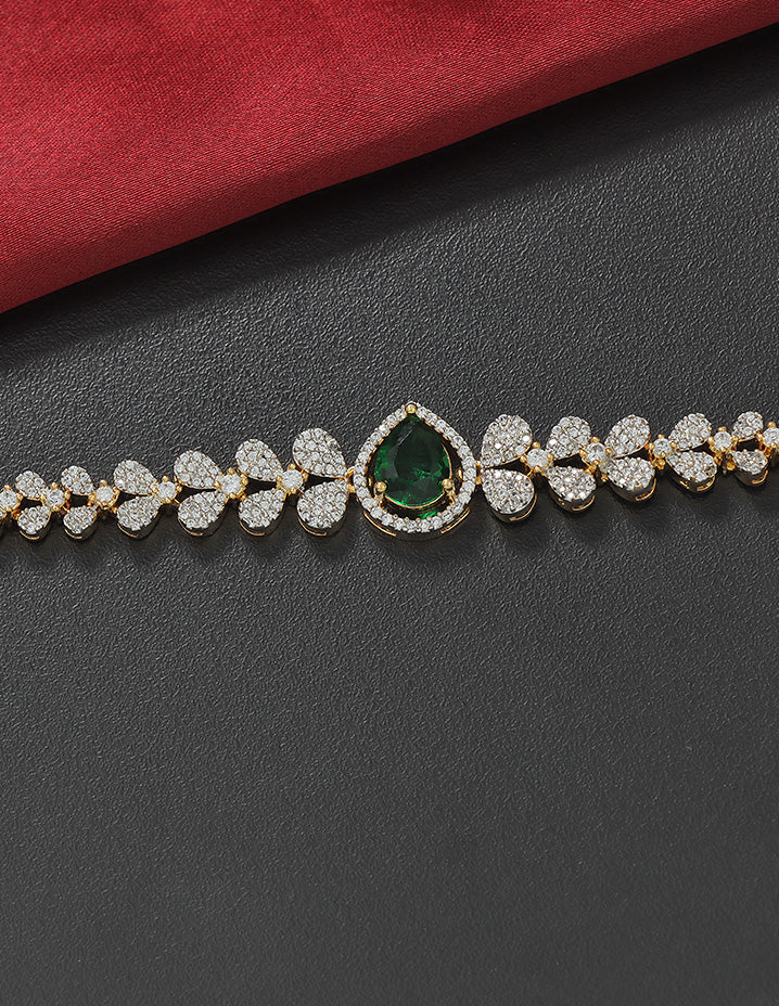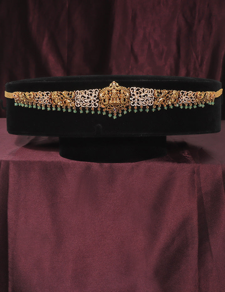 This Designer GJ Polish Zirconia Chain Vaddanam combines a sleek gold and rhodium polish with sparkling emerald white stones, offering a graceful and enduring accessory that enhances traditional elegance.