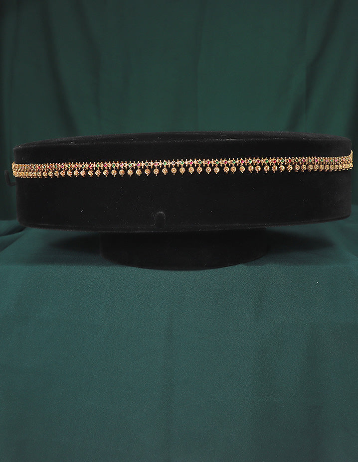 This Designer gold Polish Zirconia Chain Vaddanam combines a sleek gold polish with sparkling ruby white stones, offering a graceful and enduring accessory that enhances traditional elegance.