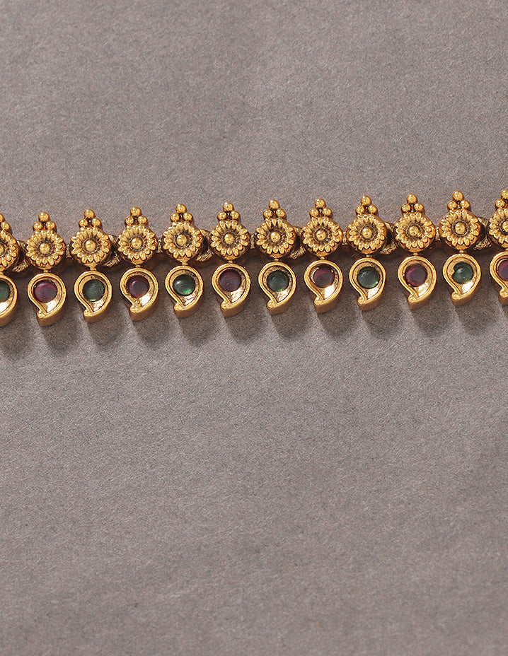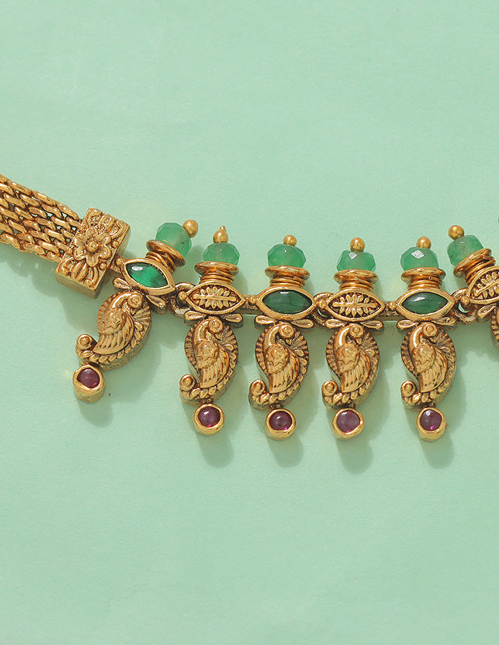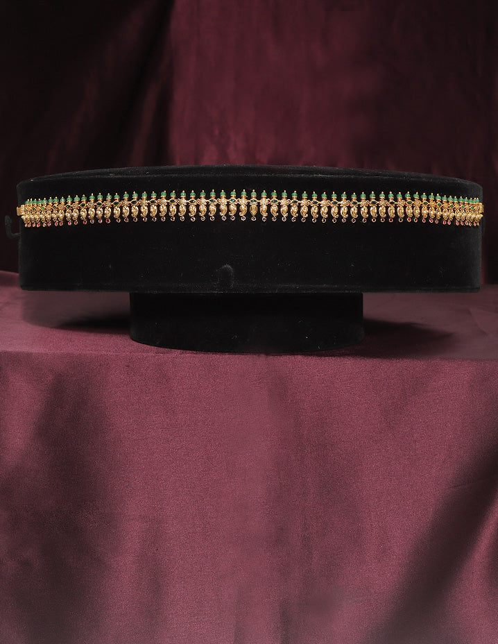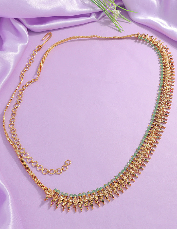 This Antique polish chain Vaddanam is equal parts chic and ethnic. The delicate design of the hip belt is what makes it stand out. Studded with rubies and emerald green stones, this Vaddanam is something you can style with a wide variety of outfits. Pair it with an indo-western outfit and spill your creativity!