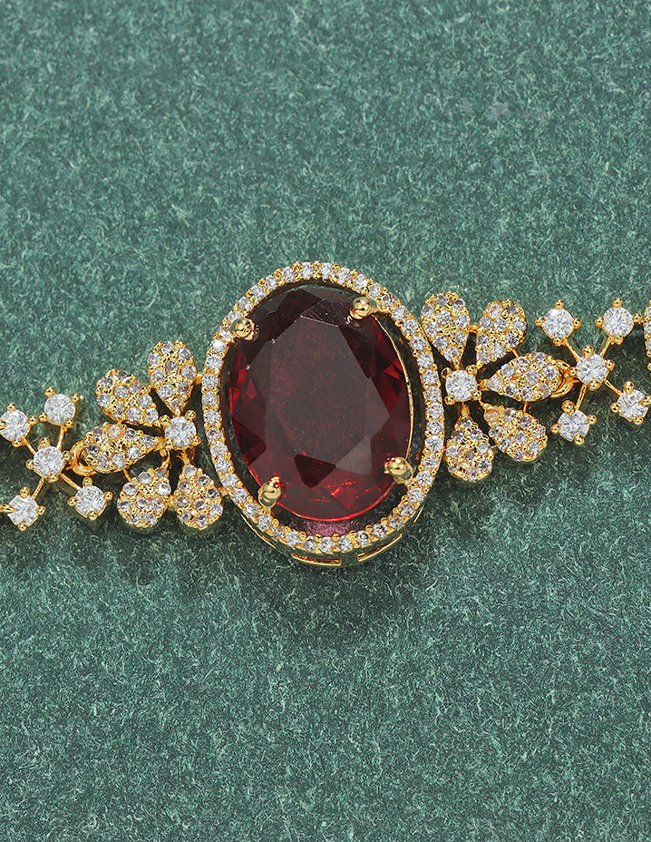 This Designer Zirconia Mango Shape Chain Vaddanam features ruby and white tones with a sophisticated gold matt polish, appealing to customers who value elegant and timeless ethnic jewelry. It is crafted for those seeking exquisite detail and lasting comfort in their traditional accessories.