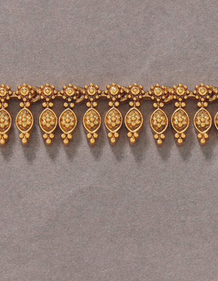 The Designer Mango Shape Chain Vaddanam appeals to customers seeking traditional elegance with a modern touch. It offers a unique mango-shaped design that enhances ethnic attire with sophistication and craftsmanship.