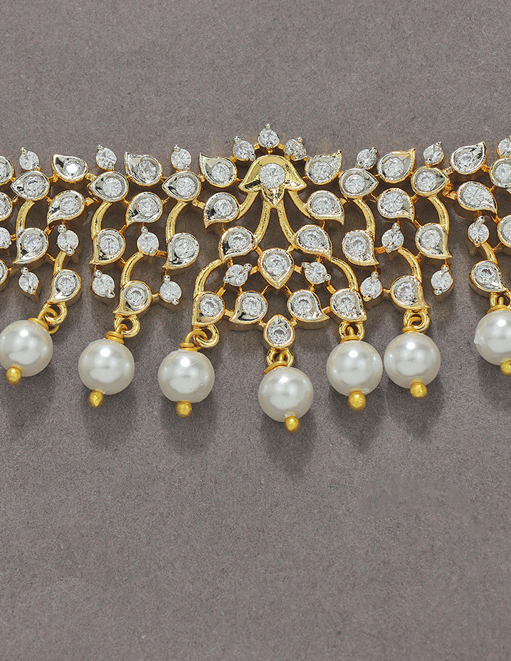 Elevate your traditional attire with this Designer GJ Polish Zirconia Chain Vaddanam, expertly crafted with a blend of gold and rhodium for enhanced durability and lustrous shine. Adorned with sparkling zirconia stones, this chain vaddanam offers refined elegance and complements various ethnic styles, making it perfect for weddings and special occasions. Its intricate design ensures a comfortable yet secure fit, adding both sophistication and grace to your ensemble.