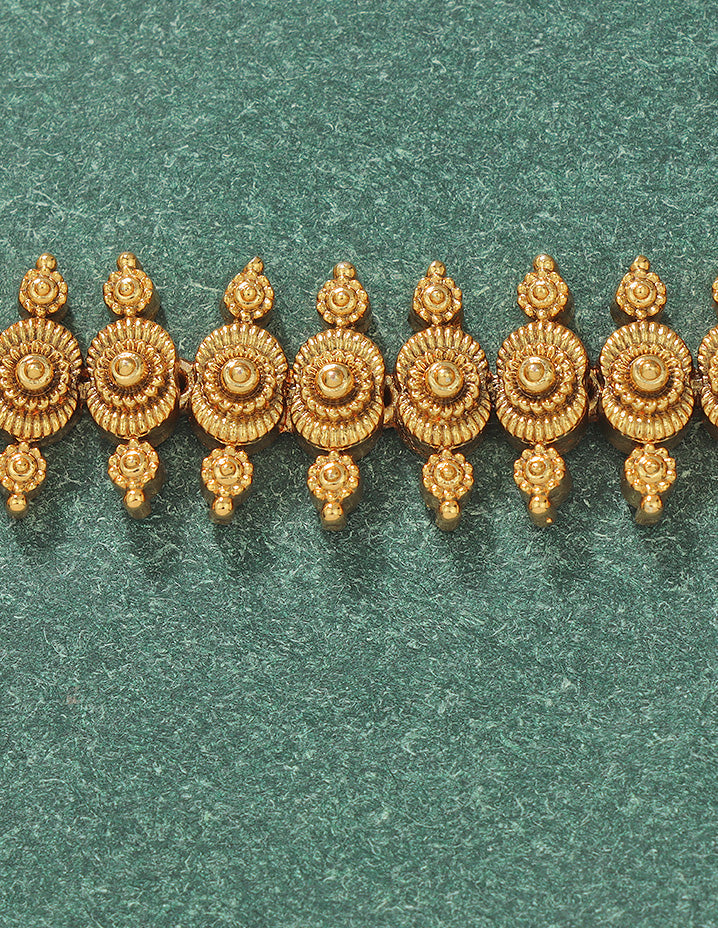 Elevate your traditional attire with this Designer Gold Polish Zirconia Chain Vaddanam, expertly crafted with a blend of gold for enhanced durability and lustrous shine. Adorned with sparkling zirconia stones, this chain vaddanam offers refined elegance and complements various ethnic styles, making it perfect for weddings and special occasions. Its intricate design ensures a comfortable yet secure fit, adding both sophistication and grace to your ensemble.