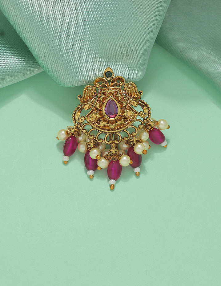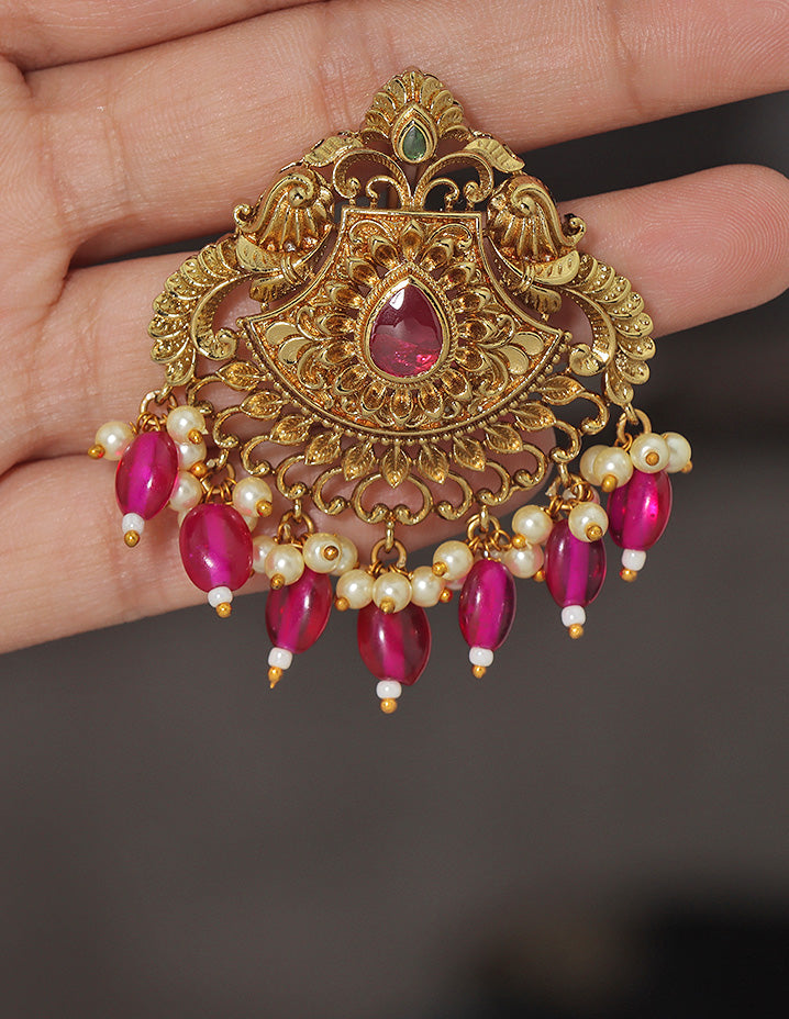 A majestic temple-style Choti Piece featuring an ornate gold finish, centered ruby stone, intricate motifs, and rich danglings of pearls and ruby beads—perfect for traditional grandeur.