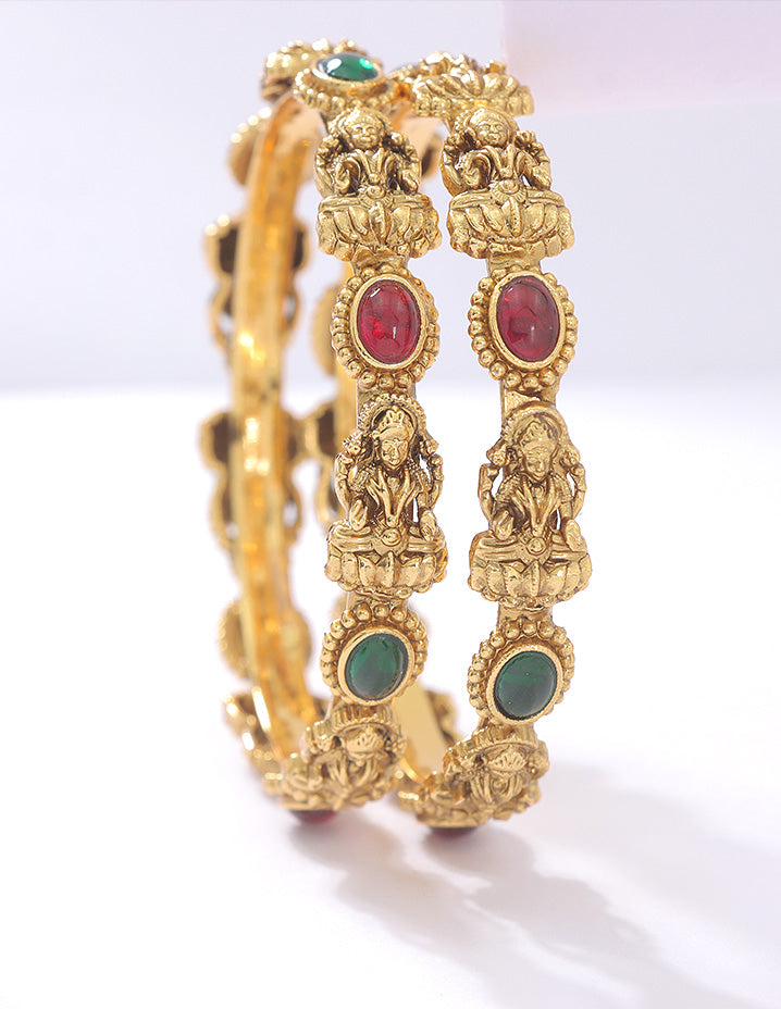 These beautiful Antique plated Baby Bangles are made of the highest quality metalwork and fine art. These elegant bangles are embroidered with dazzling Ruby and emerald Kempu stones. Best for any season, this fashionable set of bangles will make you stand out in the crowd any day. Whether its a friend's party or a traditional event, this bangle is perfect for any occasion.