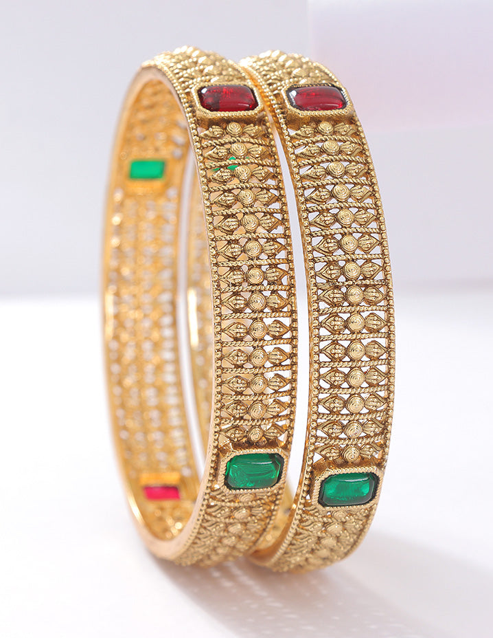 Stunning Matt plated bangles with rich Ruby & Emerald Kempu stones, crafted with fine metalwork. Perfect for parties or traditional events – a must-have for any festive look!