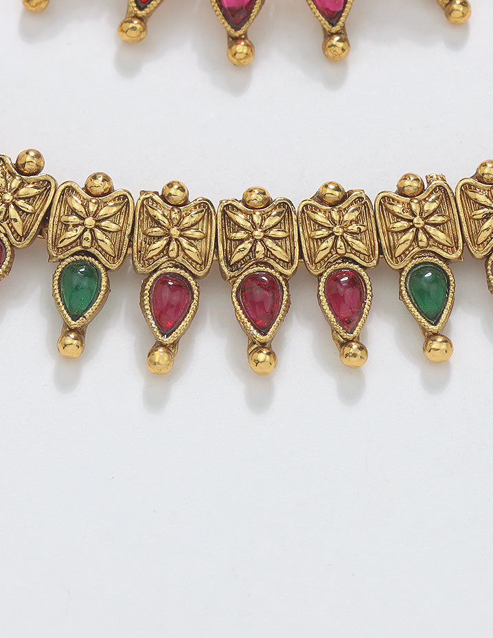 Adorn your ankles with elegance using the Paisley Grace Kemp Anklet Set, featuring vibrant ruby and emerald kemp stones in charming paisley motifs. A graceful blend of tradition and style, perfect for festive flair or everyday ethnic wear.