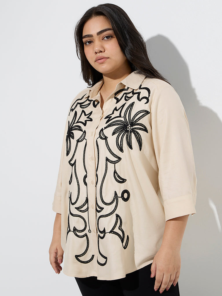 This beige shirt from Gia boasts intricate embroidery at the front for a distinctive charm. Fashioned with a collar that extends to a button placket and three-quarter sleeves, this lightweight garment offers effortless elegance.