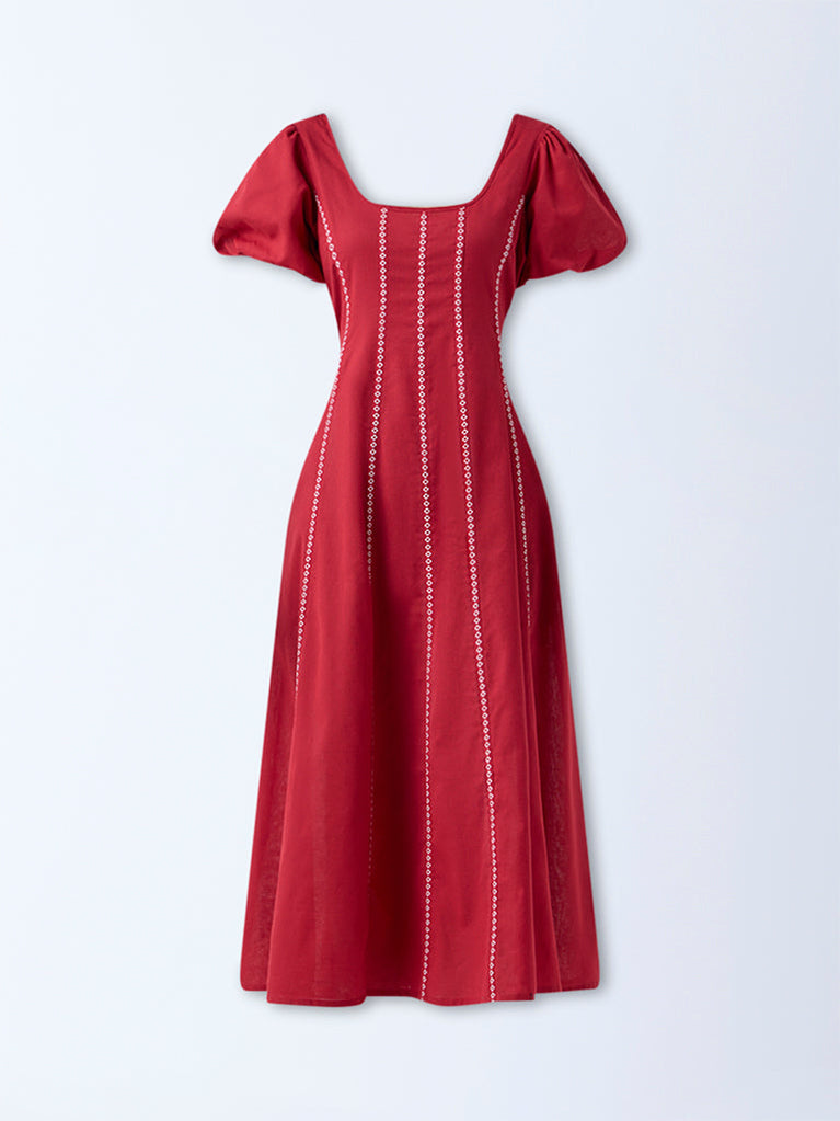 Bombay Paisley Red Embroidered Cotton A-Line Dress