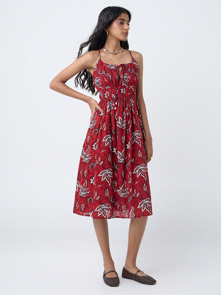 Make a lively statement with this red dress from Bombay Paisley, patterned with vivid floral motifs across an A-line silhouette. Crafted from a cotton-rich fabric, it features a scoop neckline with drawstring ties, adjustable strap and an elasticated bodice that creates a smocked effect.