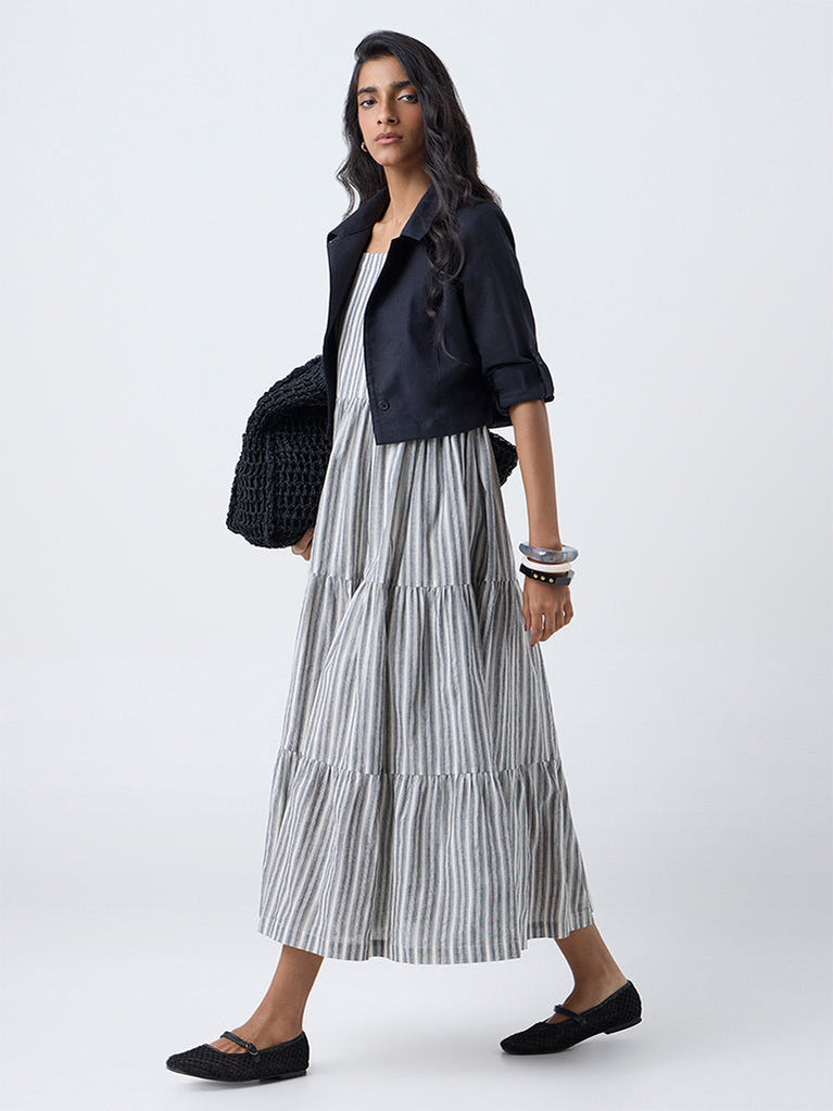 This black dress set from Bombay Paisley showcases an elegant play of bold stripes across a tiered silhouette. It is designed with a square neck, adjustable straps and a smocked back for comfort and ease. Crafted from pure cotton for a soft, breathable feel, this chic separate is paired with a matching jacket for a cohesive look.