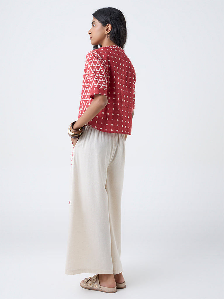 This red top from Bombay Paisley captures the brand’s signature handcrafted spirit. Made from textured cotton, it’s elevated with intricate embroidery and lace-trimmed edges along the neckline and sleeves. The sleeveless cut keeps the look light and airy, making it a perfect match for boho-inspired separates.