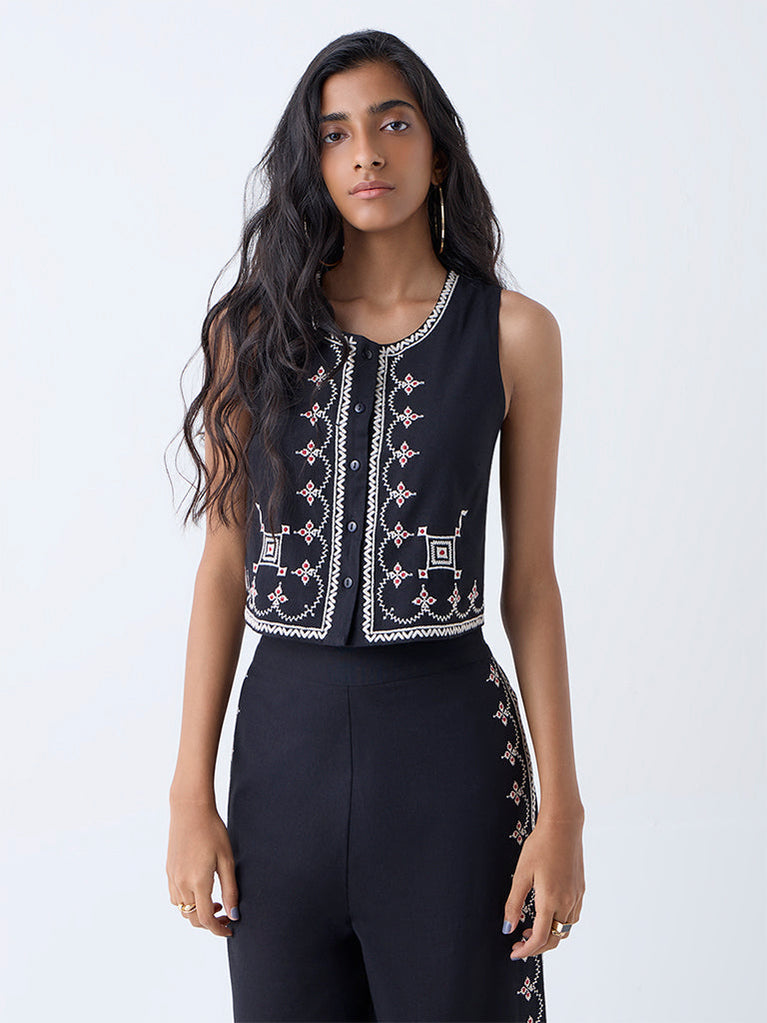 Infuse everyday ease with a hint of craft in this black top from Bombay Paisley. Milled from pure cotton, it features delicate embroidery across the front that adds artisanal character to its clean silhouette. The round neck and sleeveless design keep it light and versatile—perfect for warm days, layered looks, or a breezy vacation moment.