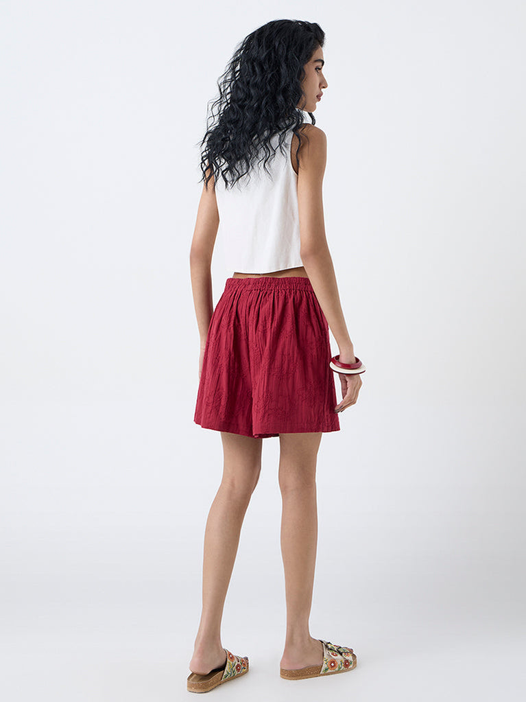Refresh your outdoor style with this red skorts from Bombay Paisley. Spun from pure cotton, it features delicate paisley embroidery that adds a soft boho character. The design is finished with an elasticated waistband and a front button closure for easy wear.