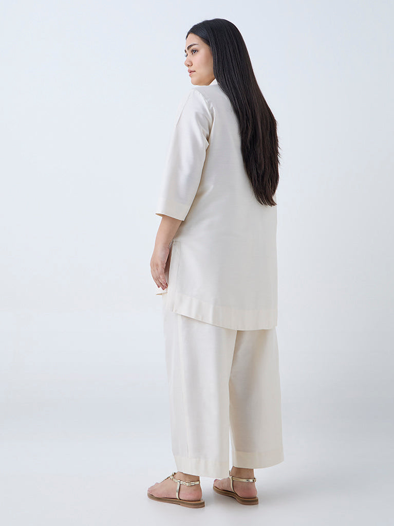 These off-white ethnic pants from Diza balance comfort with quiet structure. Spun from a breathable fabric for daily comfort, they’re fitted with an elasticated waistband, adjustable drawstrings, and side pockets for added utility.