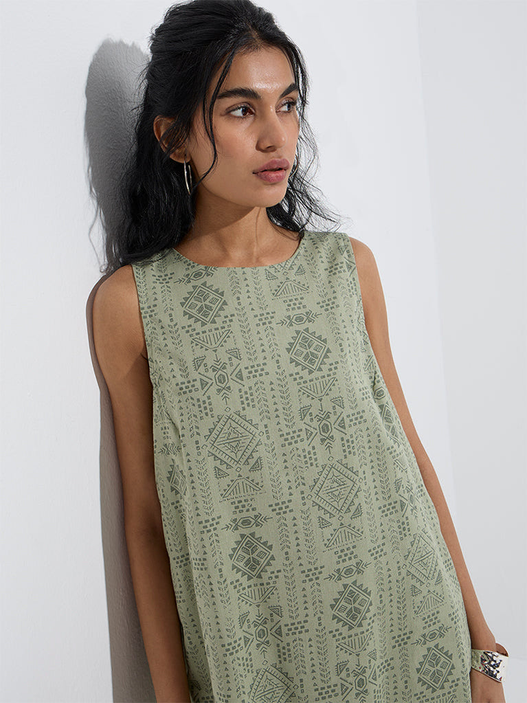 This sage dress from Bombay Paisley is detailed with a mix of tribal-inspired motifs and crafted from a soft cotton-blend fabric for easy comfort. Framed with a round neck and a sleeveless silhouette, it offers a relaxed yet stylish look perfect for warm days.