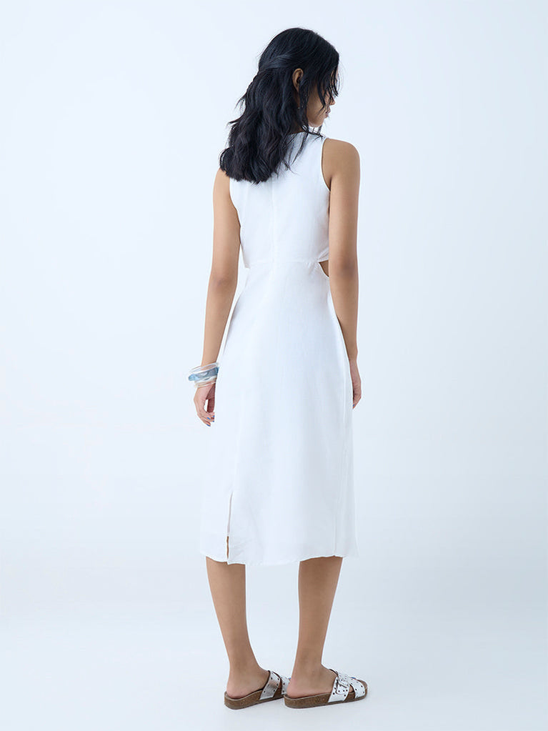 This white sheath dress from Bombay Paisley blooms with vibrant floral prints. Spun from a soft cotton-blend fabric, the fitted silhouette is styled with a round neck and further accentuated with cut-out detailing at the waist for a stylish look.