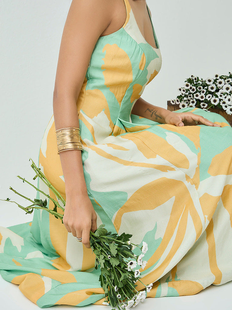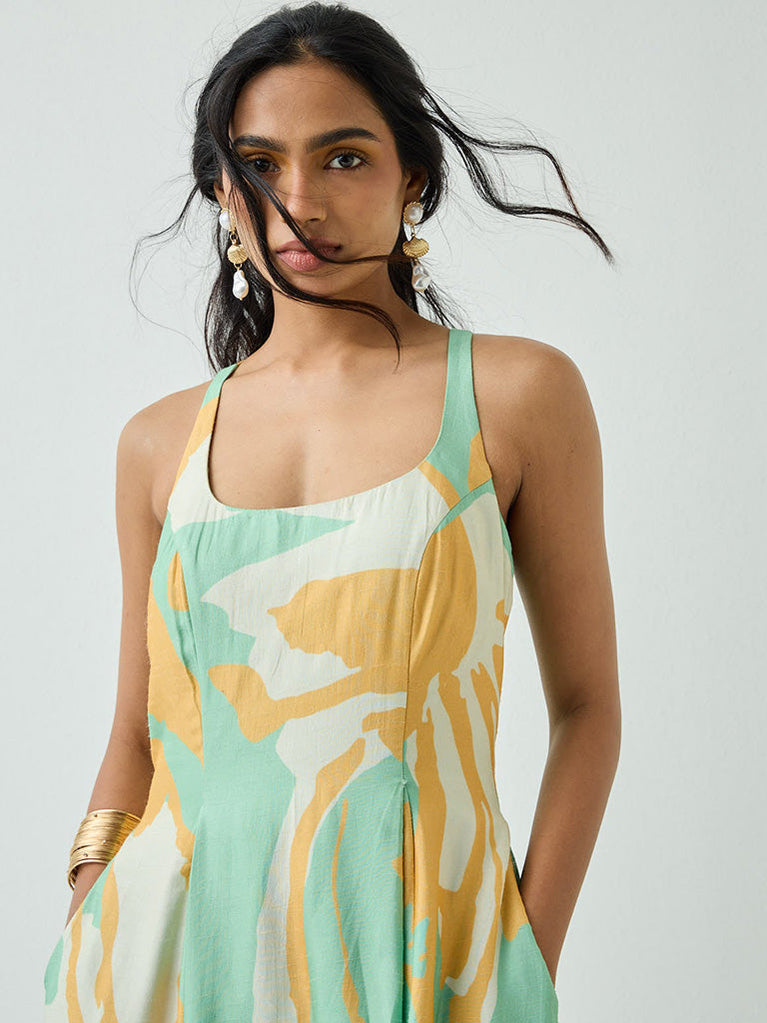 A breezy mint midi dress made for warm, easy days. Designed with a soft A-line silhouette, a square neckline, and delicate shoulder straps, it offers a flattering, relaxed fit. The abstract print adds a fresh, modern touch, while the lightweight feel keeps it comfortable and effortless. Pair it with sandals for a laid-back summer look.