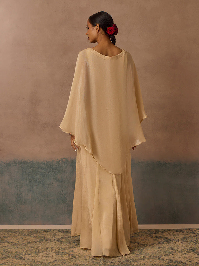 For occasions that call for quiet drama, this dress delivers presence without excess. The square neckline sets a structured frame, complemented by dense beadwork and sequins that cascade down the front with soft shimmer. The silhouette is softly fitted through the bust and waist before falling into a fluid A-line shape. Dramatic cape sleeves extend from shoulder to mid-back, creating graceful movement with every step.