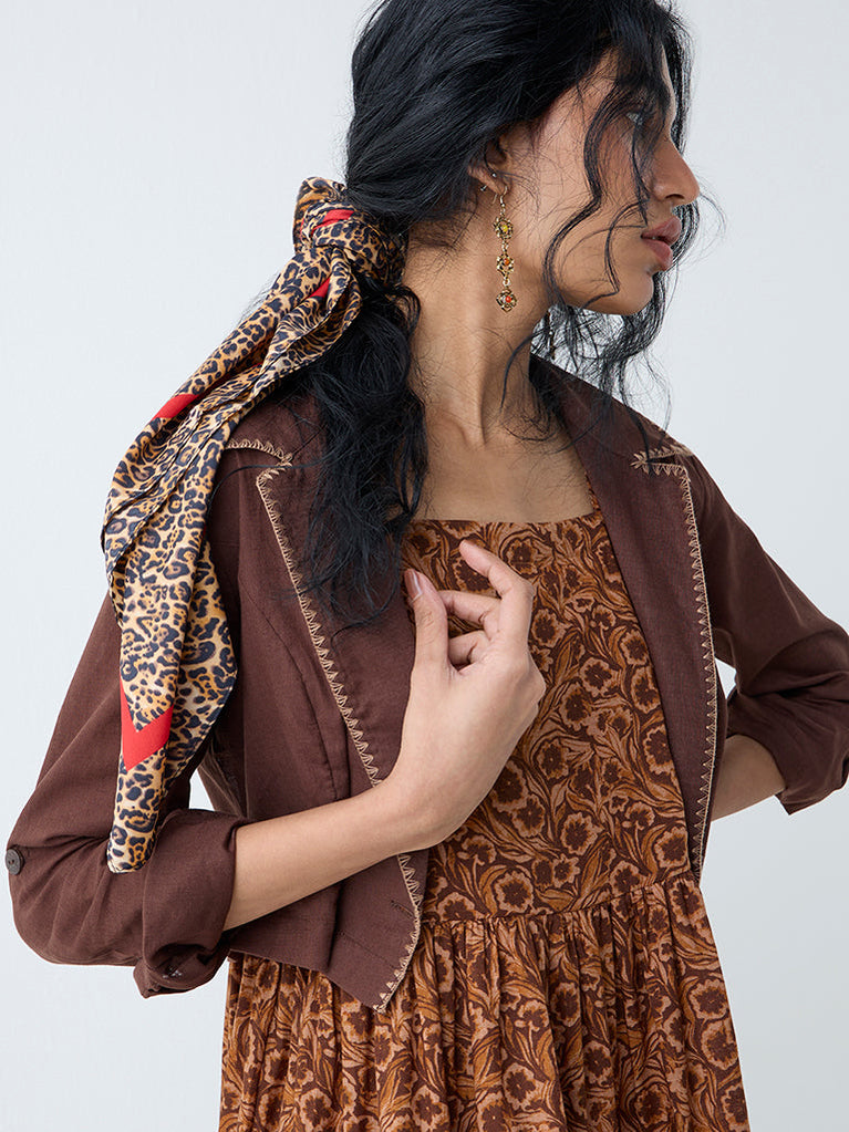 Amplify your off-duty style with this brown dress from Bombay Paisley. Printed with delicate florals, it’s designed with a square neck and adjustable straps, while the tiered silhouette lends it a breezy flow. Finished with a cropped jacket, the set creates a coordinated look that balances comfort and contemporary appeal.