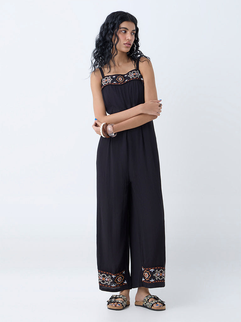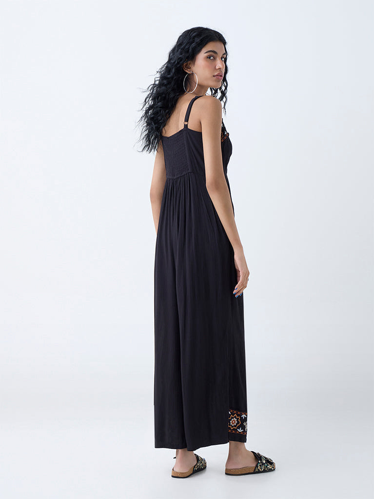 From coffee runs to weekend wanderings, this black jumpsuit from Bombay Paisley makes effortless dressing a reality. Floral embroidery traces the square neck and hem, while adjustable straps, a smocked back, and functional side pockets ensure comfort meets practicality. The crinkle-textured fabric and a concealed side zipper make it easy to slip into, letting you move through your day in style.