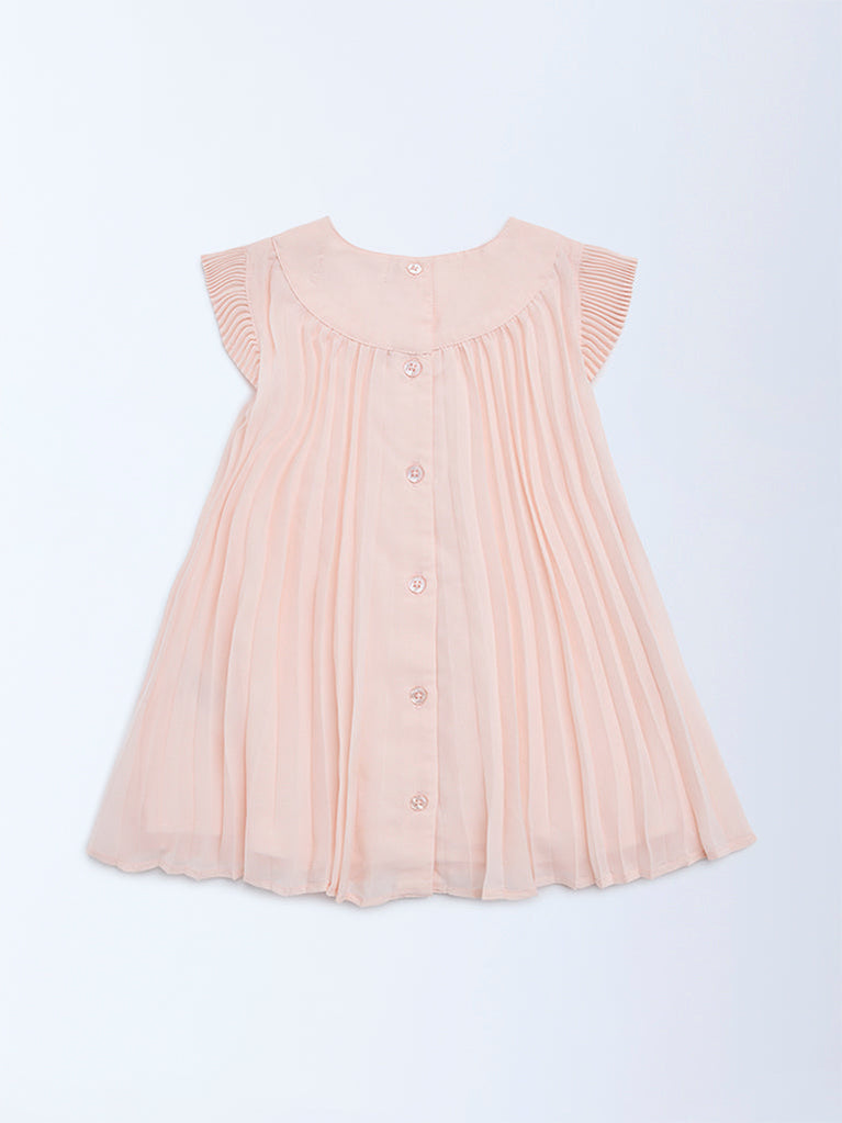HOP Baby presents this pink dress features fine pleats all over the A-line silhouette and is decorated from floral appliqués along the yoke, adding texture and visual interest. Styled with a round neck and pleated ruffled sleeves, it is completed with button closure at the back ensures easy dressing. Spun from a lightweight fabric that delivers all-day soft feel, this is an elegant and playful pick for everyday dressing.