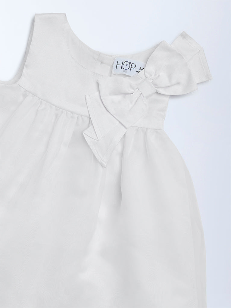 HOP Baby presents this white dress crafted from a premium, soft-touch fabric for an elegant yet comfortable feel. Designed in a fit-and-flare silhouette, it features a dainty bow detail on one shoulder for added charm. Finished with a classic crew neckline and a back button closure for easy dressing.