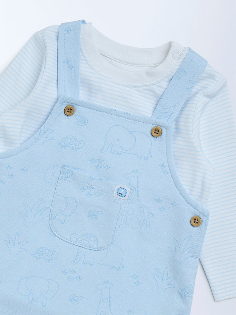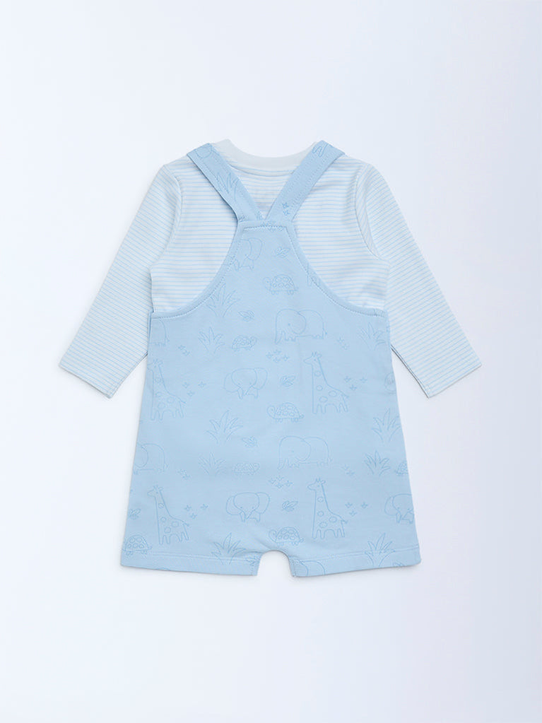 This blue set from HOP Baby is designed for comfortable everyday dressing. The striped cotton t-shirt features a round neckline and full sleeves for gentle coverage, while the dungaree is detailed with playful animal prints, a chest pocket and adjustable shoulder straps. Crafted for ease and movement, this coordinated set blends charm with practical comfort.