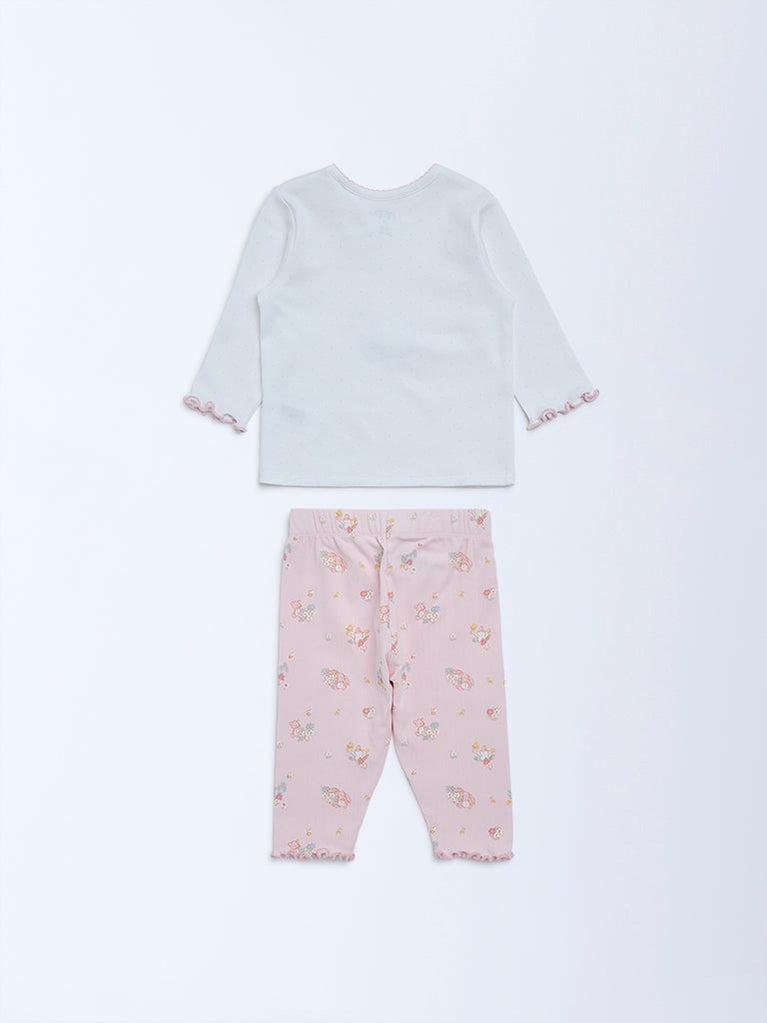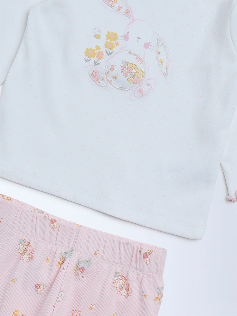 HOP Baby presents this pink set crafted from pure cotton for soft, breathable comfort. The t-shirt features a sweet rabbit and floral motif, finished with a round neckline and full sleeves. Paired with pants designed with an elasticated waistband, this set ensures a snug yet flexible fit for all-day wear.