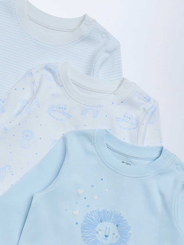This pack of three light blue t-shirts from HOP Baby is crafted from pure cotton to keep little ones comfortable through the day. Designed for everyday use, it includes two animal-printed styles and one striped option. Easy to mix and match, these tees are gentle on the skin and ideal for daily rotation.