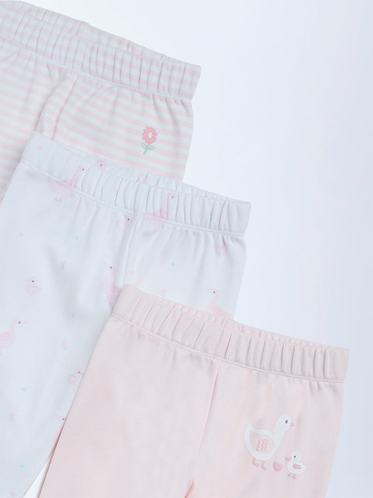 HOP Baby Girls Pink Printed Mid-Rise Cotton Pants - Pack of 3