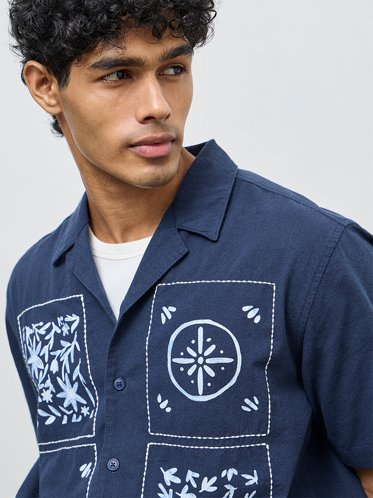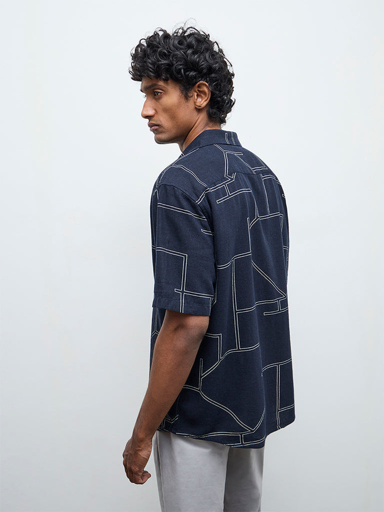 ETA Navy Printed Relaxed-Fit Cotton Shirt