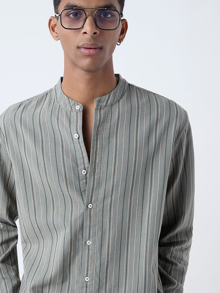ETA introduces this sage shirt showcasing stripe patterns on a cotton-rich fabric base. Designed in a relaxed-fit silhouette, it features a mandarin collar, a button-up front and full sleeves. A polished essential that brings ease and refinement to dressed-up casual looks.