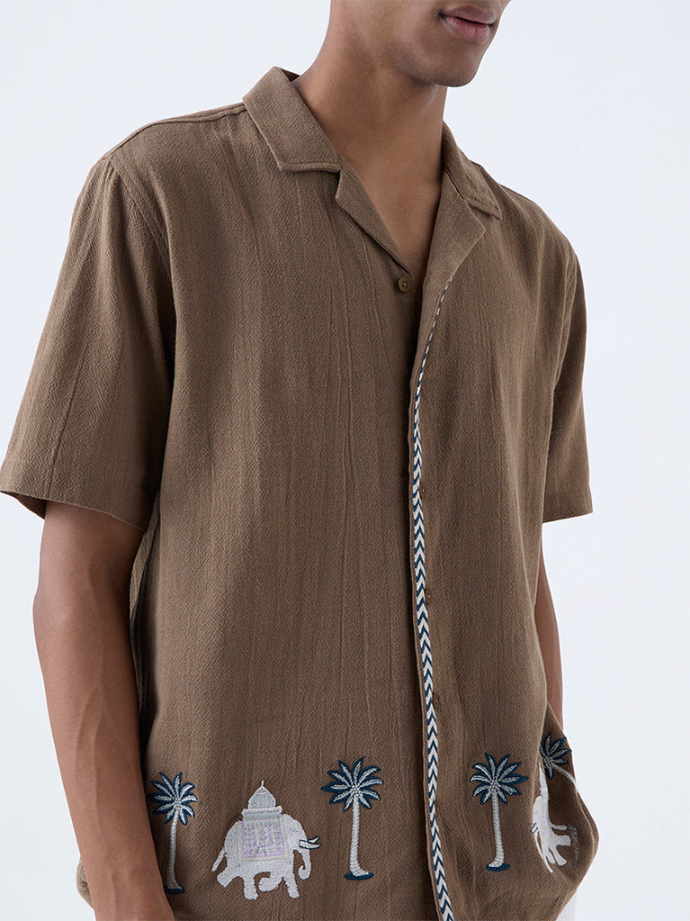 ETA Brown Embroidered Relaxed-Fit Cotton Shirt