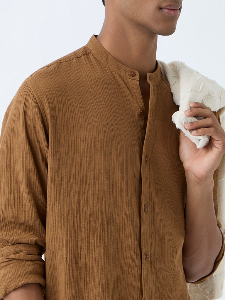 Upgrade your daytime assortment with this brown shirt from ETA. Constructed from a crinkle-textured fabric, it’s tailored in a relaxed silhouette for enhanced comfort. A mandarin collar, button-down front, and full sleeves complete the look.