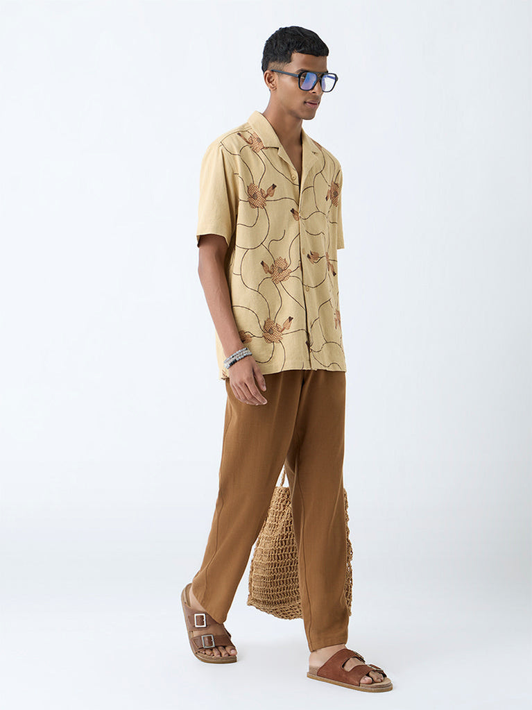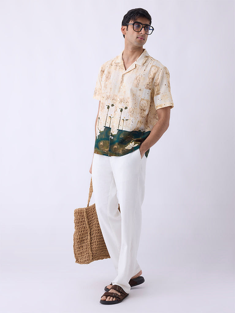 ETA Beige Floral Printed Relaxed-Fit Cotton Shirt