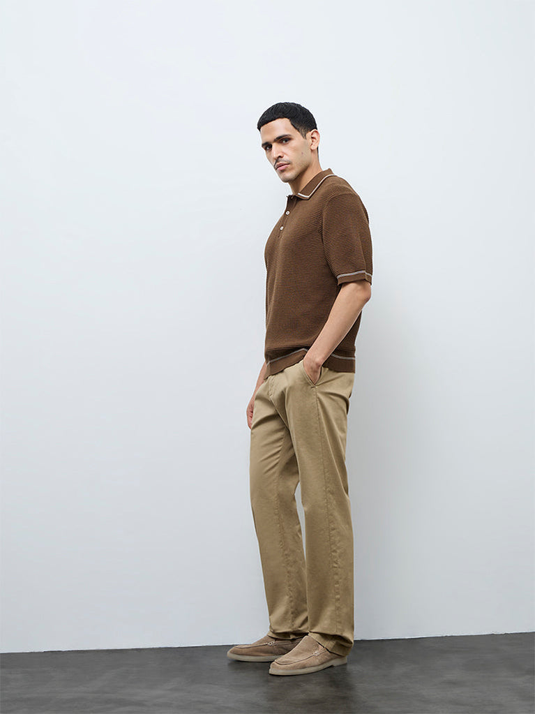 Designed to exude a polished appeal, Ascot introduces this tan polo t-shirt crafted from a soft, breathable fabric that ensures comfort throughout the day. Cut in a relaxed silhouette, it is fitted with a regular collar, short zipper placket and short sleeves. A tactile textured finish lends depth to the structured shape, making it ideal for casual outings.