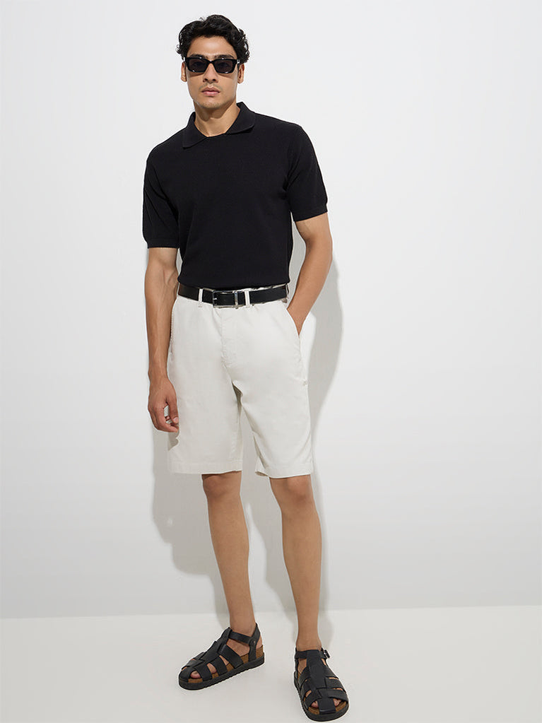 This off-white polo t-shirt from Ascot highlights self-stripes that lend depth to its refined look. Constructed from a stretch-infused cotton-blend material, it features a spread collar with a quarter-zip detail, half sleeves, and a ribbed hem that ensures a structured yet comfortable fit.