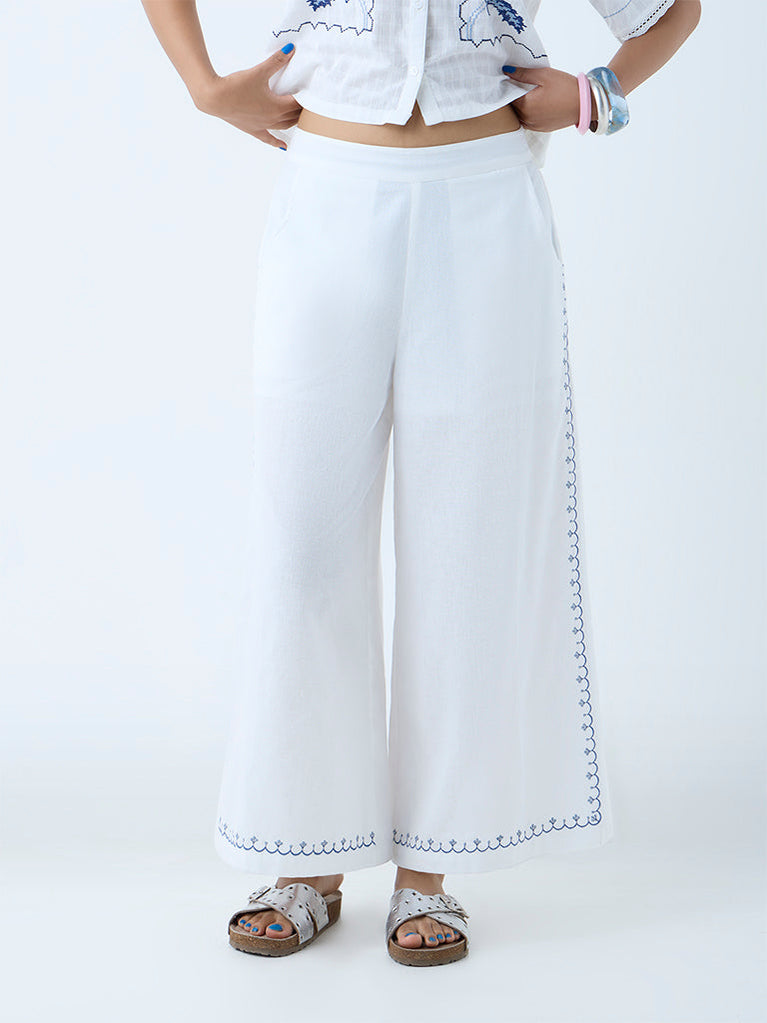 These white palazzos from Bombay Paisley flaunt intricate embroidery along the hemline for added style. Woven from a luxurious cotton-linen blend, they offer a lightweight feel ideal for warmer days. Designed with an elasticated waistband and functional side pockets, they balance comfort with everyday practicality.