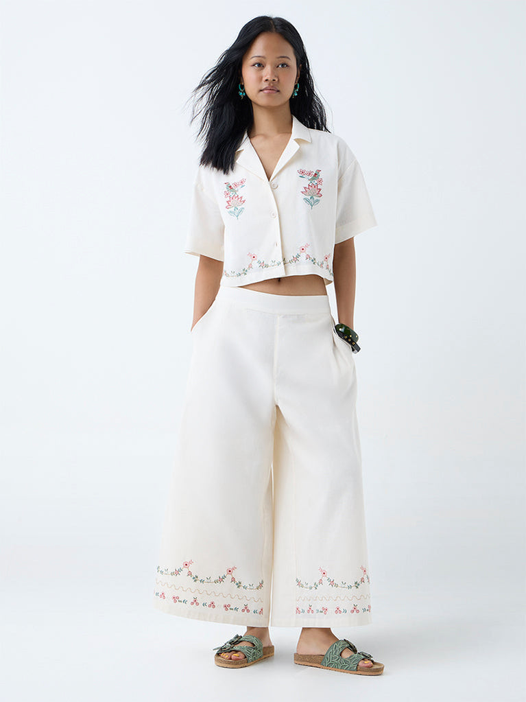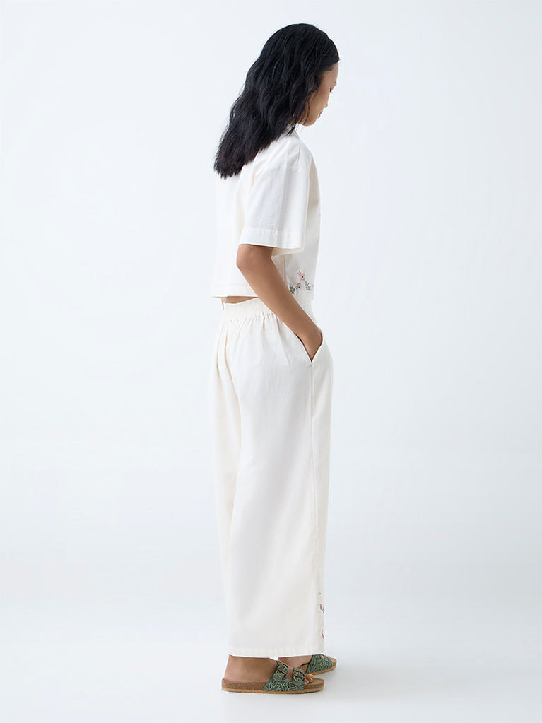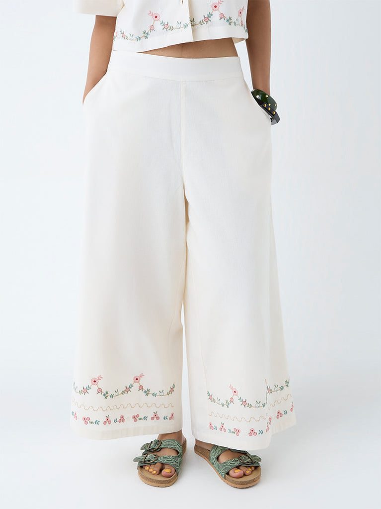 Bombay Paisley Off-White Floral Embroidered Cotton-Blend Palazzos