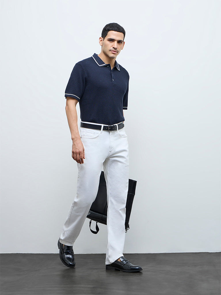 Ascot presents this navy polo t-shirt woven from a cotton-blend fabric with a knit-textured finish. It is designed in a relaxed fit, carrying a contrast detailed collar, a brief button placket and short sleeves. Finished with stripe-printed accents on the sleeves and hem, it adds a refined touch to everyday casual wear.