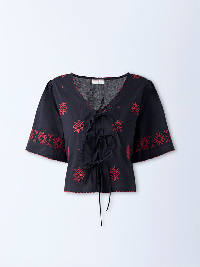 If you love pieces that feel handcrafted and unique, this embroidered black top by Bombay Paisley is a wardrobe favourite waiting to happen. The cross-stitch motifs add artisanal detail, and the scalloped deep V-neckline offers a feminine touch. A front tie-up enhances the boho aesthetic, while the pure cotton base keeps the fit light and breathable.